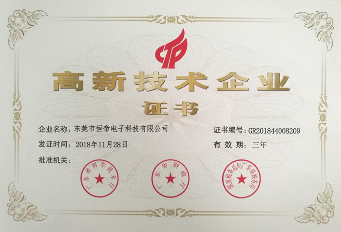 近日,經國家科技部、財政部、國家稅務總局專家評審,東莞市恒帝電子科技有限公司獲得了由廣東省科技廳、財政廳、省國稅局、省地稅局聯合頒發的《高新技術企業》證書,這標志著我司成為國家高新技術企業的一員。
